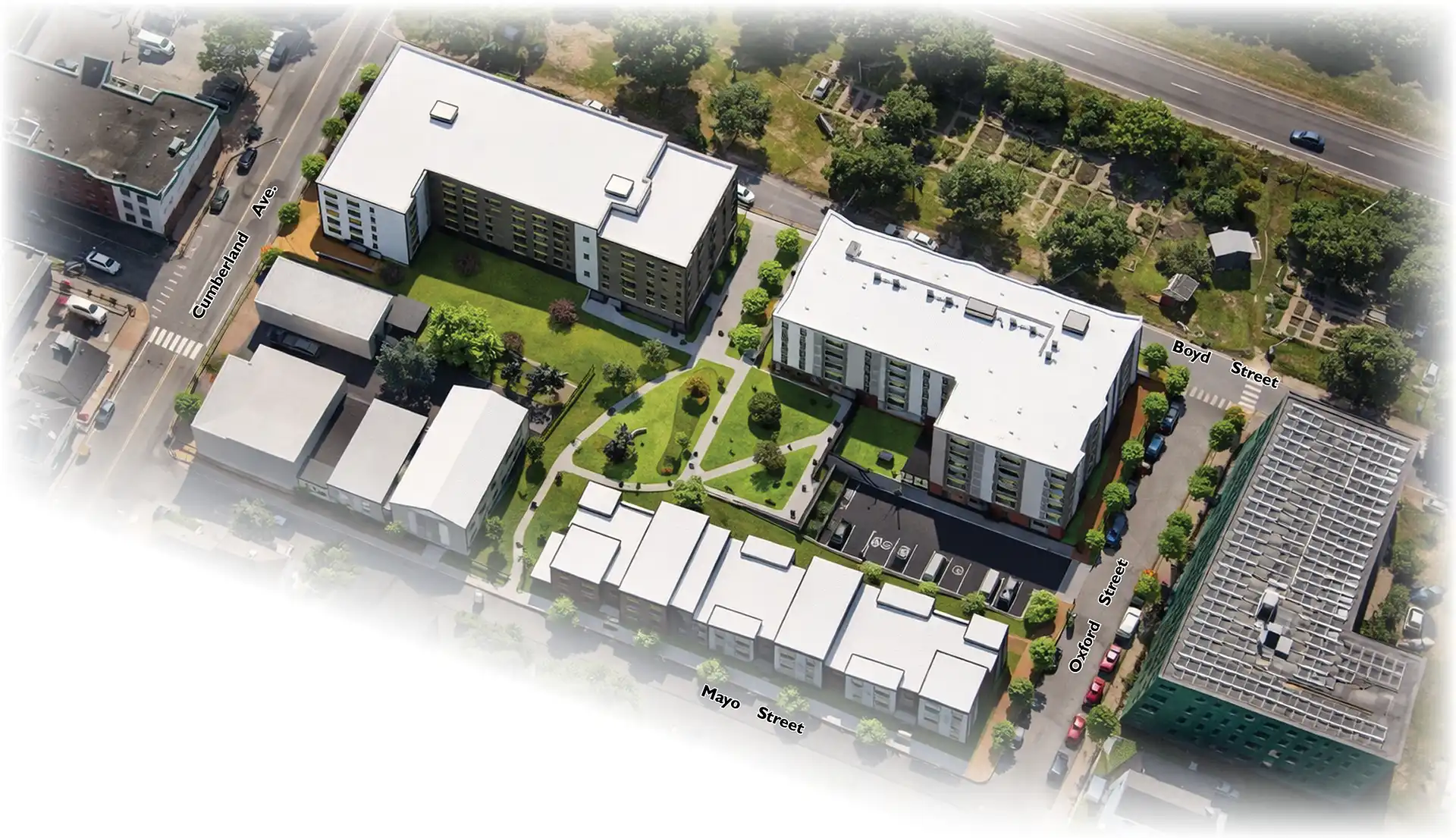 Located at 70 E. Oxford Street, Phase 1 occupies approximately ±0.56 acres of the larger ±1.53‑acre COMB Block site. The COMB Block redevelopment will replace four existing residential buildings constructed in 1972 that are in poor condition. The project begins this summer with Brownfield remediation, addressing contaminated soils and urban fill materials and preparing the site for redevelopment prior to vertical construction.