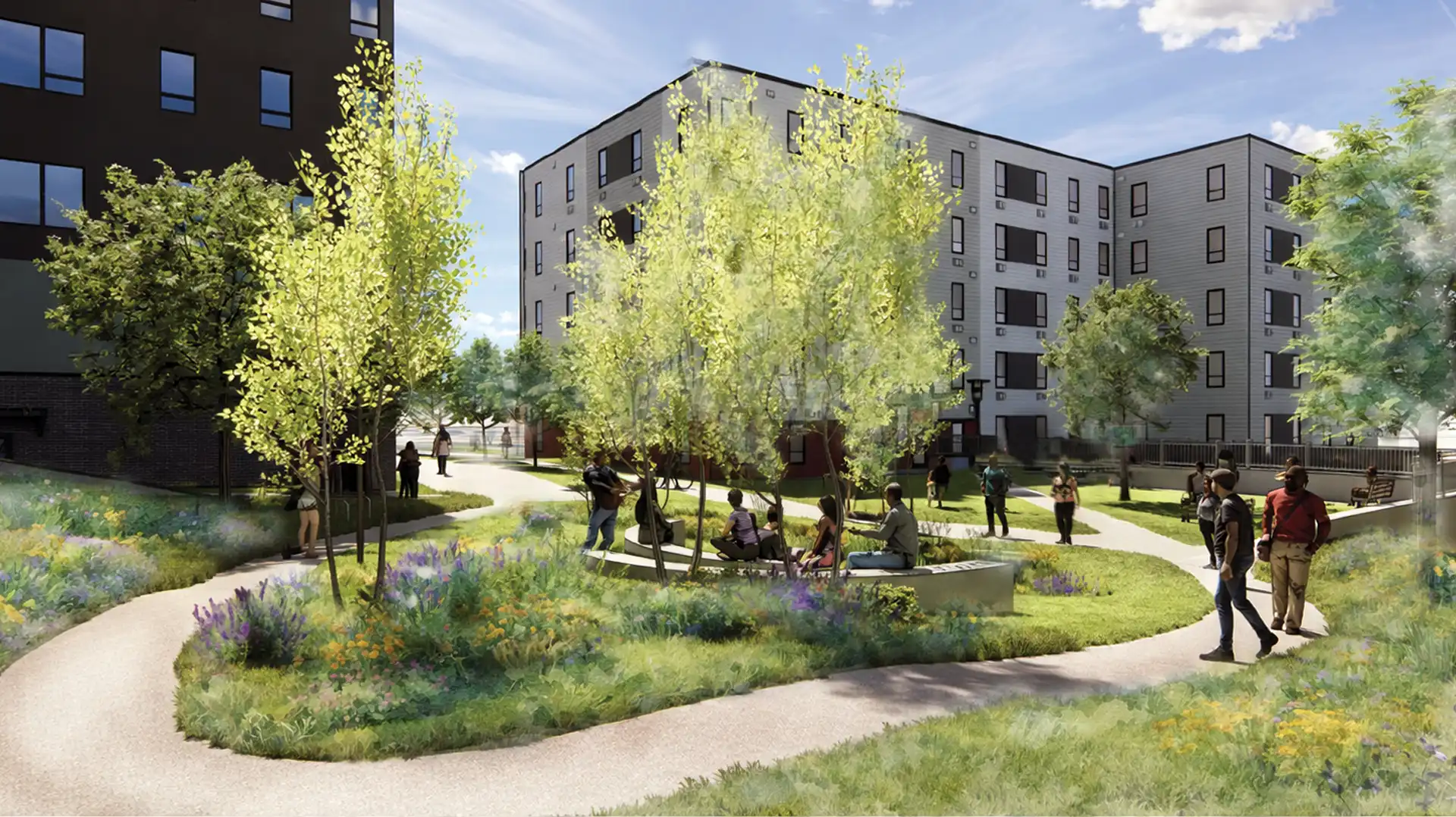 Resident amenities will include on‑site laundry facilities, bike storage, and a community room. A shared green space is planned between buildings, providing outdoor gathering space and enhancing the livability of the site.