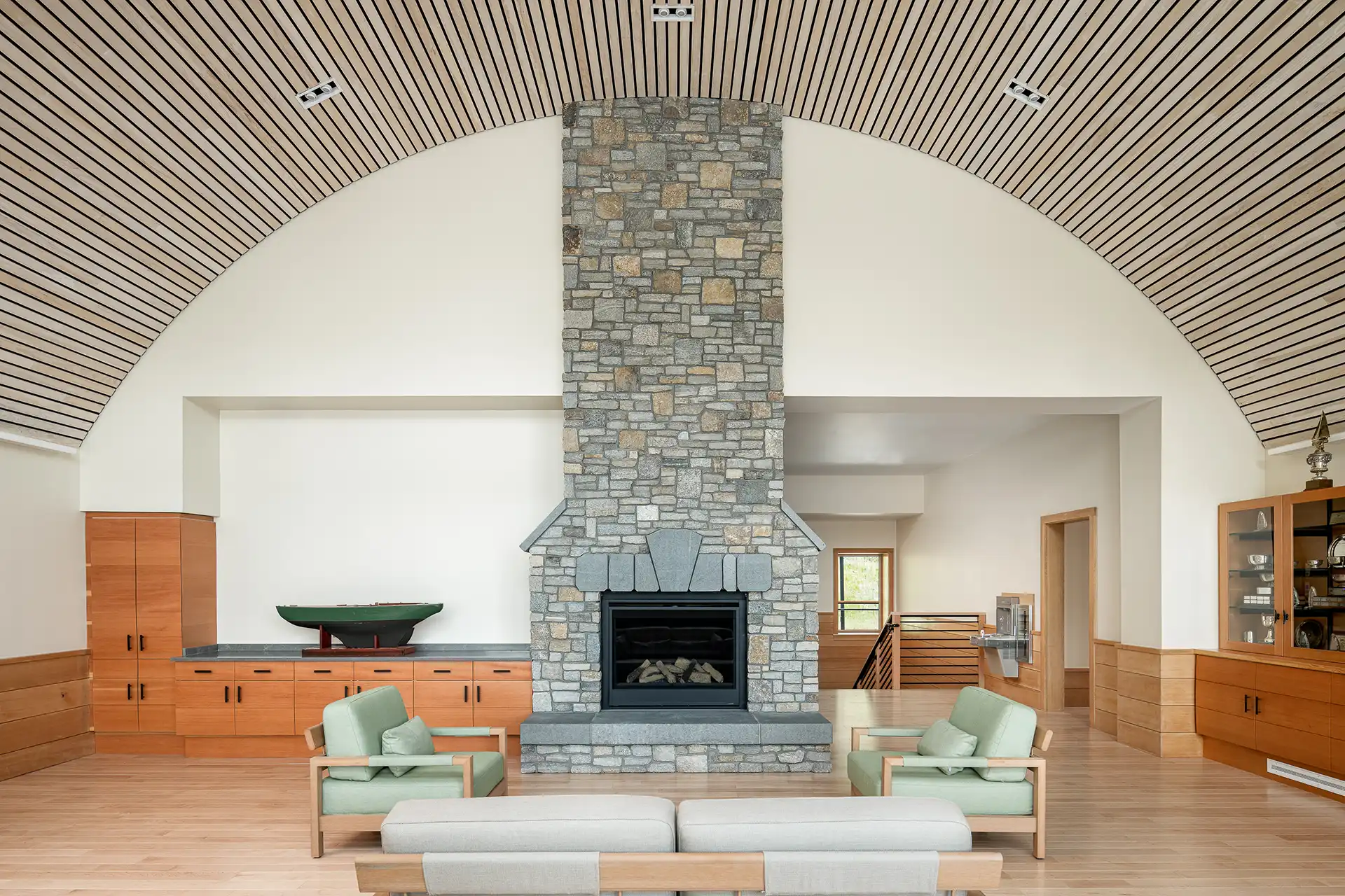 The boathouse features an inviting interior anchored by a stone fireplace, expansive glass openings that frame sweeping lake and mountain views, and a dramatic curved wood ceiling in the main gathering space. Designed for modern training and competition needs, the facility includes two varsity locker rooms, a team room, a coaches’ office, and dedicated changing rooms for visiting teams and the community boating program. A dedicated viewing room and connected deck provide spectators with a comfortable vantage point to watch races while taking in the surrounding landscape.