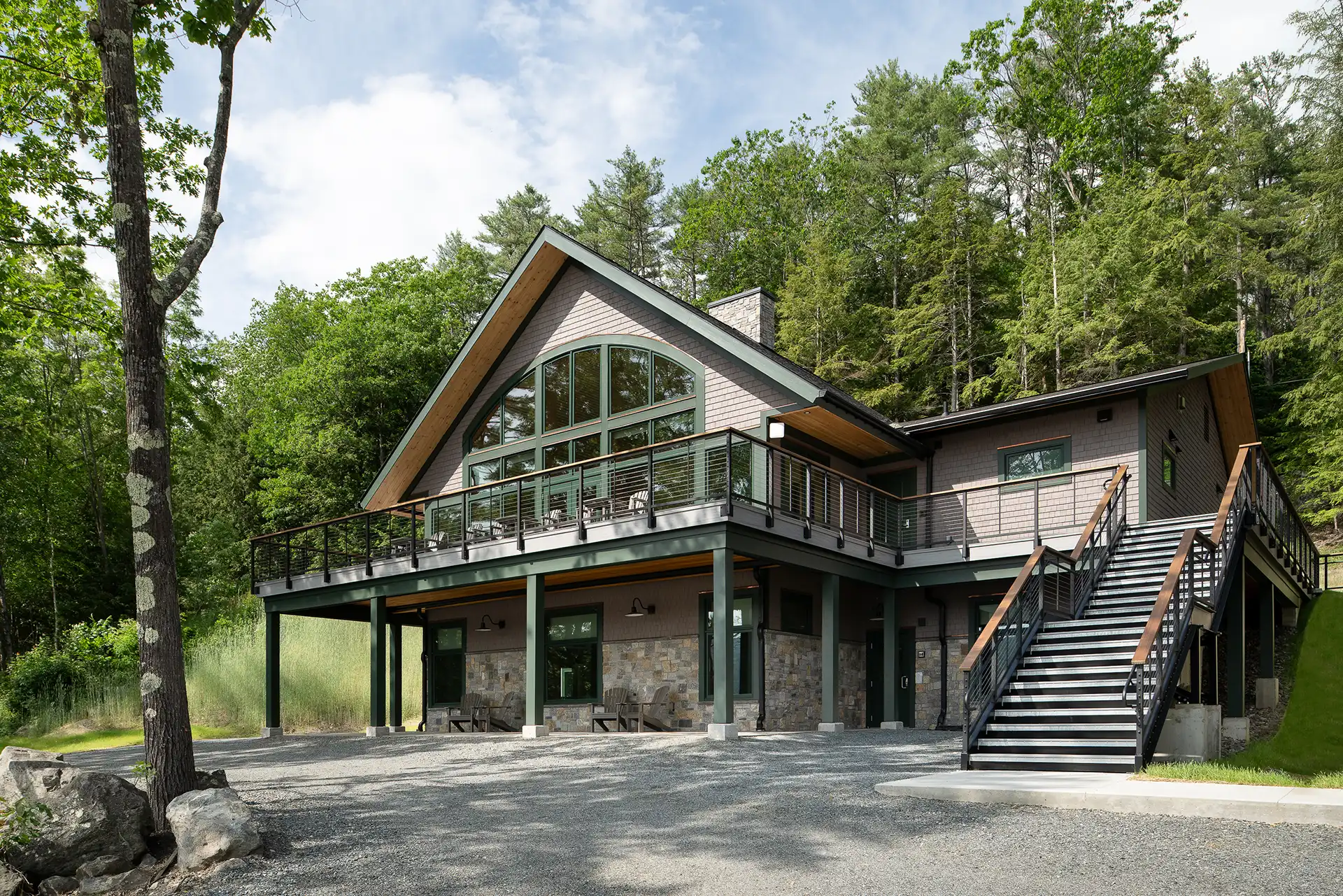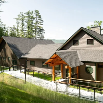 Before construction began, the project team cleared the site of aging structures and overgrowth and completed ledge blasting to prepare the hillside for the new buildings. The design respects its environment, blending into the natural shoreline so the building’s scale remains unobtrusive from the water.