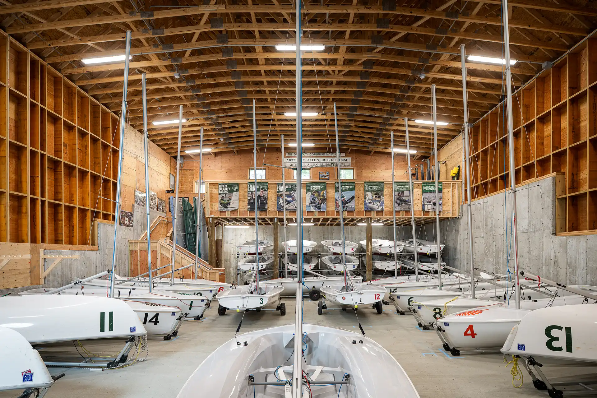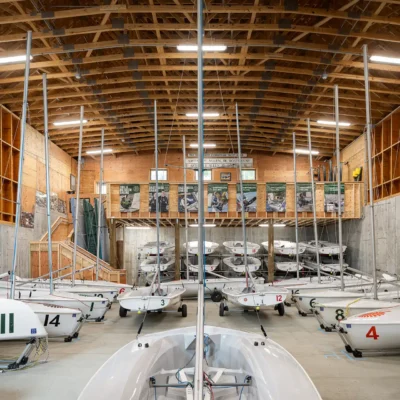 The new boat barn was purpose‑built to house the full fleet with boats fully rigged—masts up and sails on—streamlining daily operations and maximizing valuable time on the water. This represents a significant upgrade from the team’s previous 1950s facility, which required boats to be dismantled for storage. With improved efficiency and modern amenities, the new Sailing Center supports the varsity team, spectators, and the broader community boating program, all while celebrating the beauty and spirit of Lake Mascoma.
